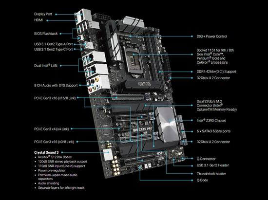 其他配置方面,ATX標(biāo)準(zhǔn)板型,10相供電,24針主供電接口和8+8+6針輔助供電接口,但散熱片并不算很夸張。四條DDR4內(nèi)存插槽,最高頻率4266MHz,最大容量64GB。六個(gè)SATA 6Gbps,兩個(gè)M.2-22110 32Gbps(均覆蓋散熱片)、兩個(gè)U.2 32Gbps。