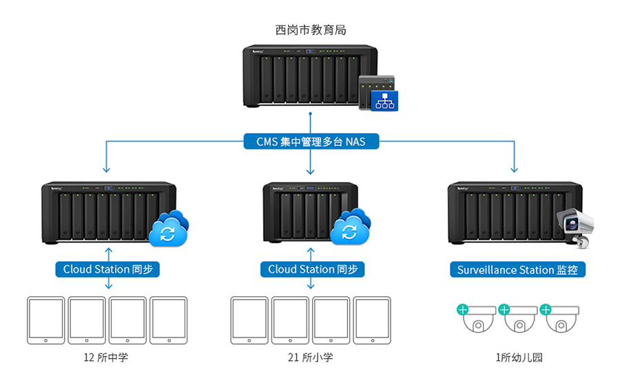 經(jīng)過審慎評估,西崗區(qū)教育局決定在教育局購置一臺 DS1815+,并且為 12 所中學配備 DS1815+,為 21 所小學配備 DS1515+。另外為其中一所幼兒園配備一臺 DS1815+,作為校園視頻監(jiān)控。?