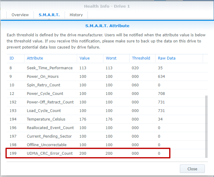 3、檢查硬盤(pán)的屬性 ID 199。如果原始數(shù)據(jù)增加,或者如果系統(tǒng)無(wú)法識(shí)別硬盤(pán),則很可能發(fā)生故障。如果更換硬盤(pán)的原始數(shù)據(jù)增加,而可疑故障硬盤(pán)的原始數(shù)據(jù)保持為零,則問(wèn)題與 Synology NAS 有關(guān)。如果在插入上一個(gè)插槽時(shí)無(wú)法識(shí)別更換硬盤(pán),則插槽可能發(fā)生故障。