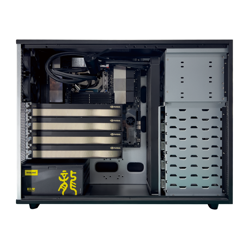 廣州天翱塔式HPC,型號為TA-W4509,搭配最新第四代Inte!°Xeon”W系列處理器,單機最高支持56核心112線程。該工作站配備了最新的 NVME 存儲選項,PCI-E5.0 上的三個 M.2 用于閃存啟動和存儲。同時可擴展4路雙寬GPU運算卡,可廣泛應用于人工智能/深度學習,高性能計算(HPC),云游戲;分子動力學模擬
